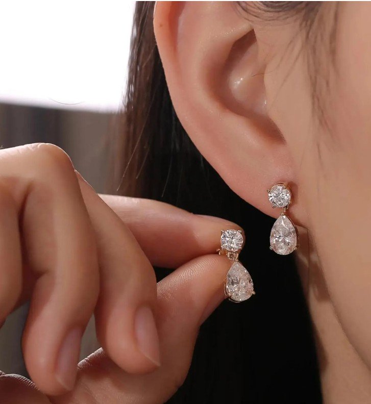 The Elara Drops capture the essence of celestial grace. These refined drop earrings feature a radiant round-cut moissanite that gently gives way to a stunning pear-shaped stone, creating a silhouette that is eye-catching.